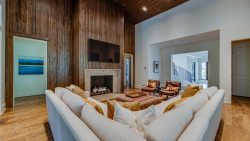 This spacious Colonial Revival plan has four bedrooms, four and a half baths, and great curb appeal, with a covered porch spanning almost the full front of the home. Entry through the foyer shows off the view through the home to a rear covered porch and the backyard. A library sits off the foyer with built-in bookcases and windows overlooking the front of the property. Across the entryway, a private living room features built-ins, and can be completely closed off with sliding doors when desired. The sweeping curved staircase to the second level is a focal point of the entry space, and beyond it, the home opens up to the kitchen and family room. The expansive island overlooks the family room fireplace, flanked by built-ins. The open concept kitchen also boasts a spacious pantry and a dining nook featuring two walls of windows. Off the family room, the covered porch has a fireplace and room for a large seating area. The entry space from the two-car garage to the kitchen has built-in cubbies for storage. The friend’s entry off the kitchen is adjacent to the one-car garage. A powder room and almost fifty square foot safe line the hallway to the unique main floor rec room. This room is perfect for entertaining friends and family, with a fireplace, wet bar, and its own covered porch, complete with a grill and large dining space. Across the home, beyond the family room, the primary suite features a window nook overlooking the backyard. The luxurious primary bath has a wall of windows, separate vanities, a walk-in shower, linen storage, spacious closets, and a private toilet. The larger of the two closets has a storage island and access to the laundry room. With a door off of the family room as well, the laundry room is located near the base of the stairs to the second level, conveniently accessible from every bedroom. A private guest suite is tucked into the front corner of the main floor, with a walk in closet and full bath.