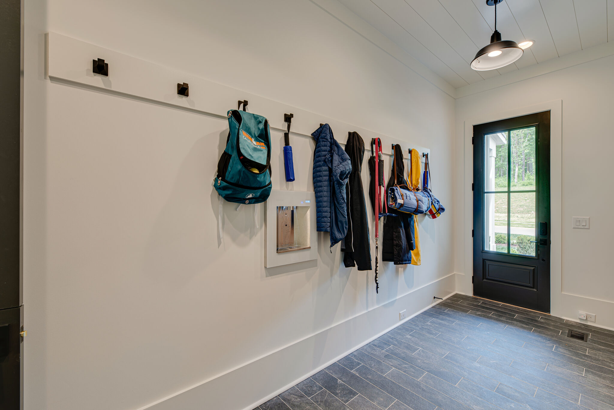 A covered front porch near the primary suite leads to an oversized laundry room with storage, a sink, a dog shower, and space for two washers and dryers. A powder room and coat closet are just off of the laundry area.